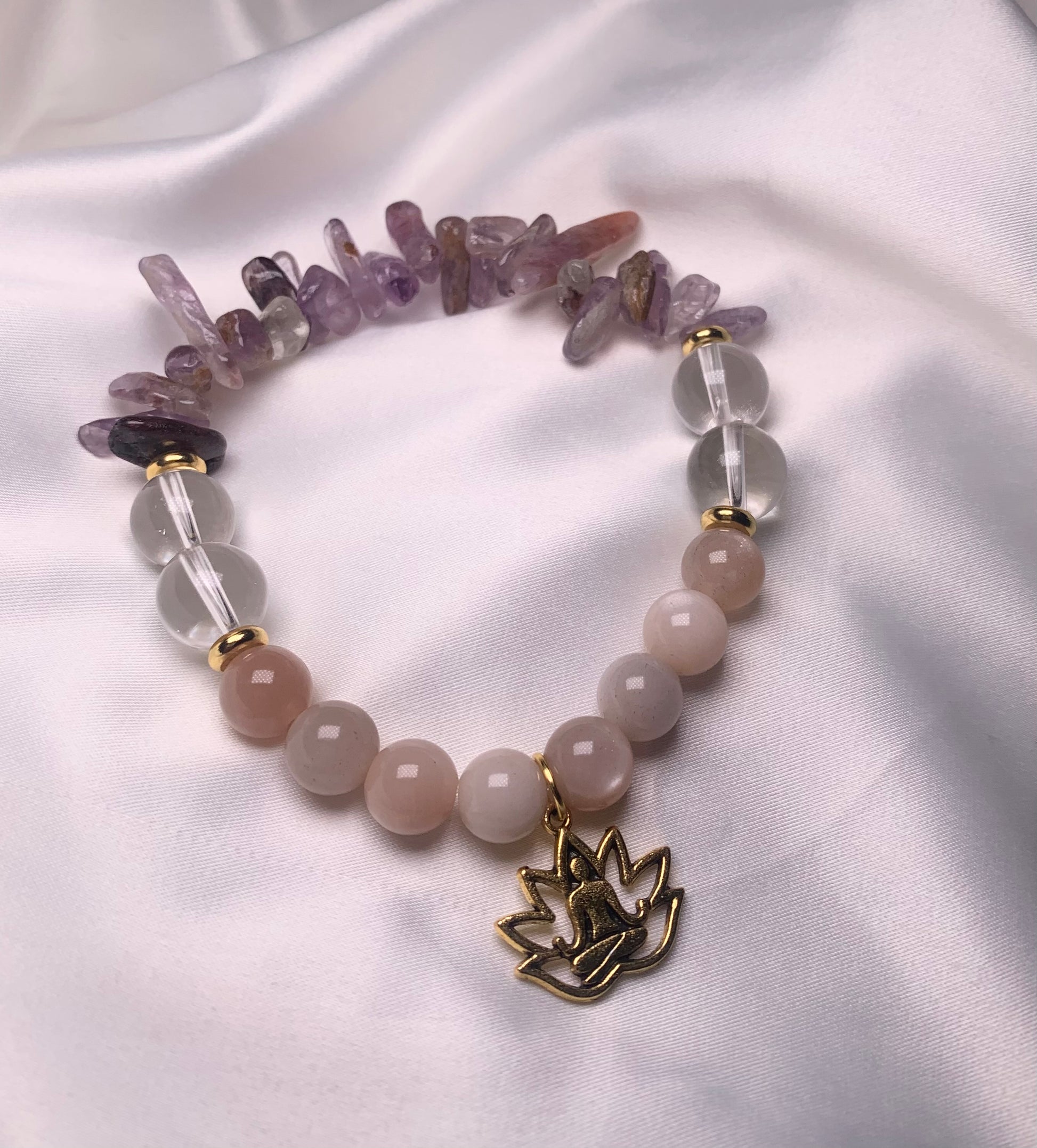 Crystal bracelet featuring a gold meditation charm. Approximately a 6.5 in. fit/stretch. To have sizing adjusted, please leave details within your order notes.
