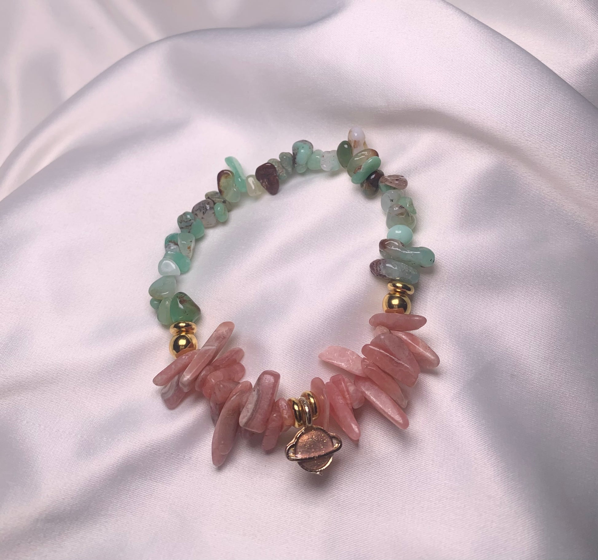 Crystal bracelet featuring a pink Saturn charm. Approximately a 6 in. fit/stretch. To have sizing adjusted, please leave details within your order notes.