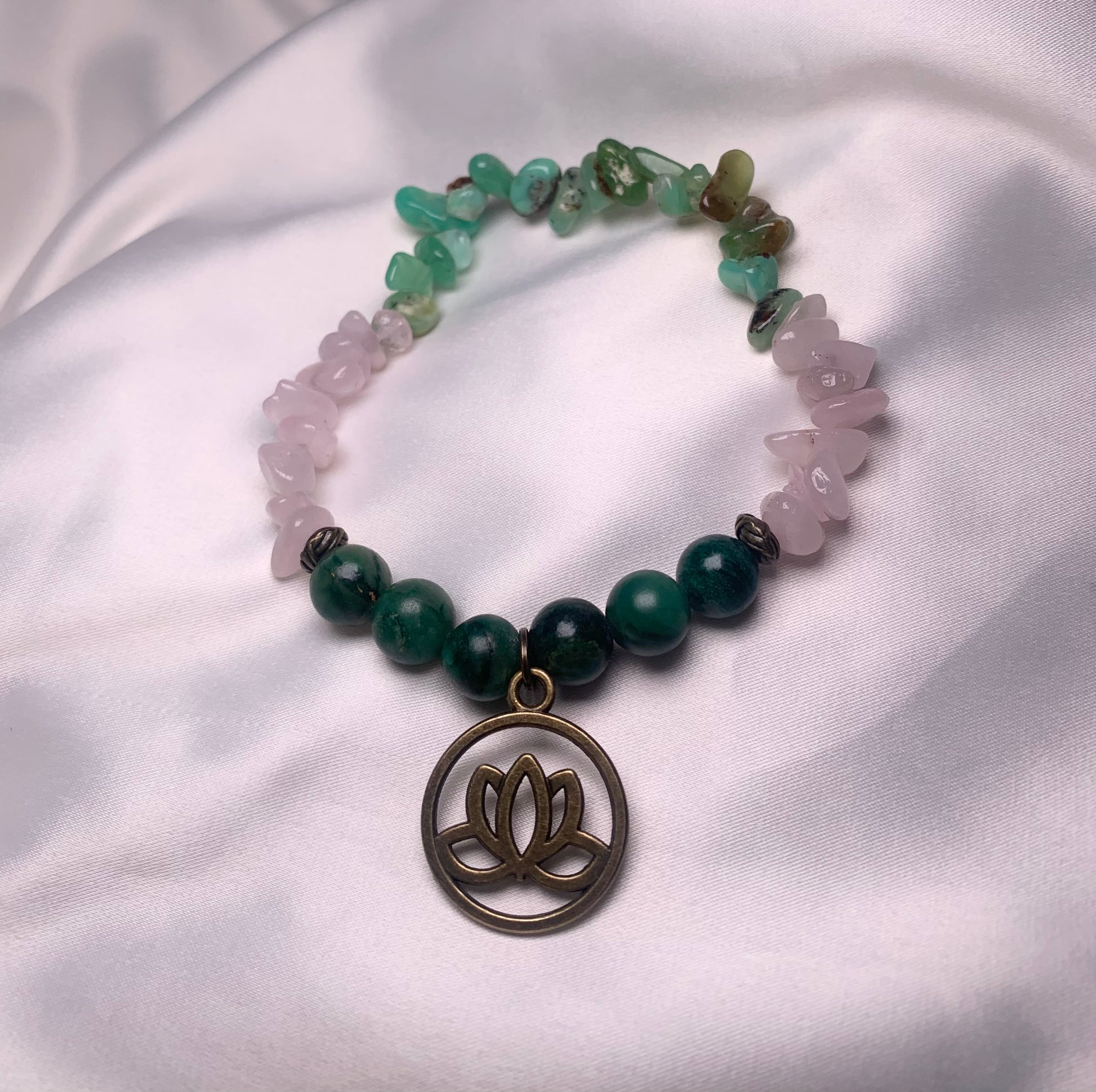 Crystal bracelet featuring a bronze lotus charm. Approximately a 7 in. fit/stretch. To have sizing adjusted, please leave details within your order notes.