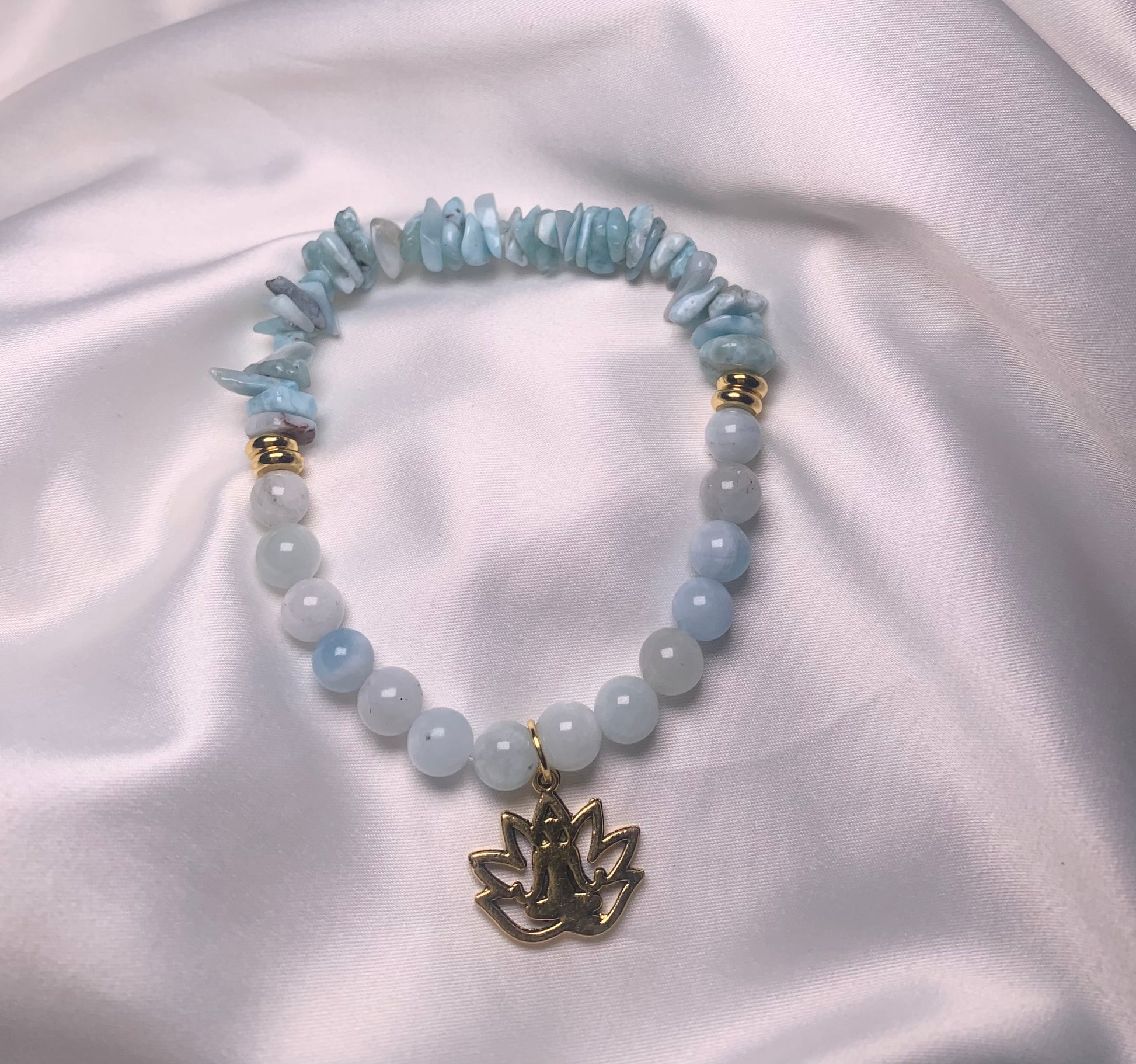 Crystal bracelet featuring a gold meditation charm. Approximately a 7 in. fit/stretch. To have sizing adjusted, please leave details within your order notes.